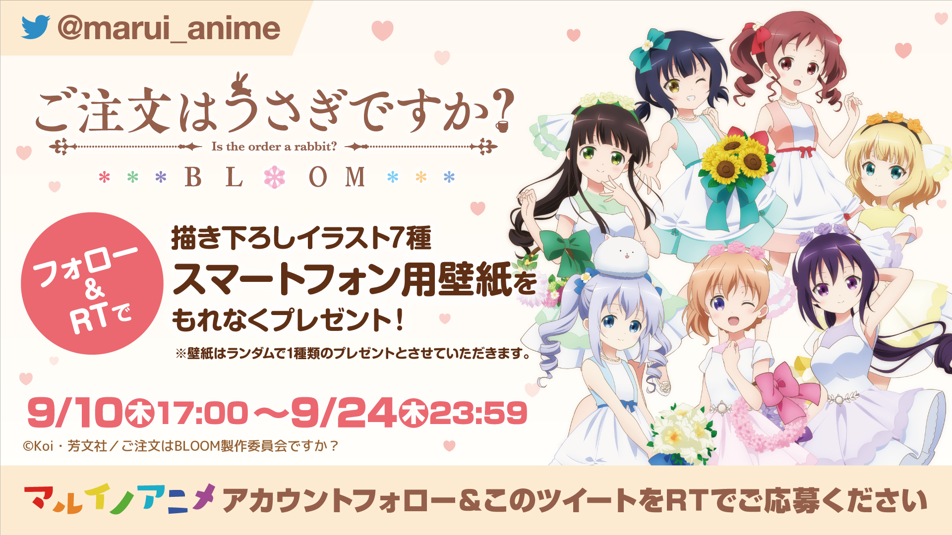 マルイノアニメ ご注文はうさぎですか Bloom 壁紙プレゼント ご注文はoioiですか イベント開催記念 壁紙7種をランダムでプレゼント 何度も挑戦して全種getしよう 9 10 17 00開始 Marui Anime をフォロー この投稿をrt 壁紙をget